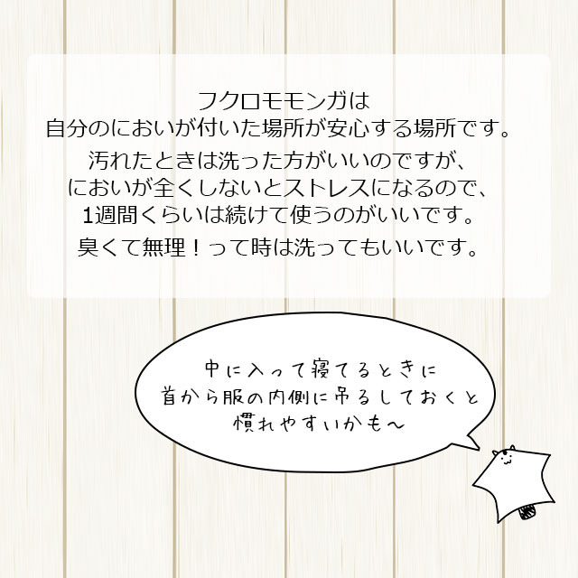 当店はフクロモモンガ用品の専門店です。 こんな隅っこまで見てくれるとは、なかなか詳しく情報を仕入れておりますね! ありがとうございます! フクロモモンガは夜行性で、野生では木の上に住んでいます。 外国ではSugar Glider(シュガーグライダー)と呼ばれています。 コアラやカンガルーの仲間で、生まれてすぐにお母さんのおなかの袋に入って育ちます。 ケージに吊るすタイプの寝ぶくろポーチや、吊るしたり固定するタイプの木製ハウスを寝床にします。 フクモモに慣れてもらうために、首からかけられるタイプのポーチも人気です。 ポーチに入れたまま首にかけて、服の内側につるします。 飼い主さんのにおいにつつまれて気持ちよく寝ていると、「飼い主さん=安心」と覚えてくれます。 (お母さんの袋の中に居心地が似ているのかもしれません) 落ち着いて眠れる場所があるとフクモモ達も安心して暮らせます。 寝ぶくろポーチは汚れやすいので、洗濯用に数枚用意してあげると便利です。 フクモモ専用フードやねぶくろポーチなどのフクモモグッズ、虫エサも取り扱っています。 大好物の虫エサは、カルシウムが豊富なソルジャーグラブが「くる病」予防にもオススメ! ほかにもメジャーなミルワームやハニーワームなどいろいろ取り揃えています。 他の商品もぜひご覧になってみてくださいね! |