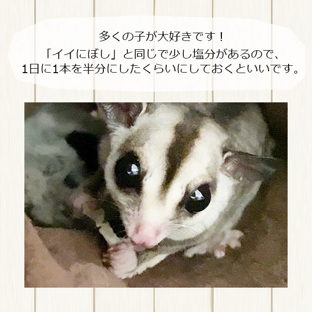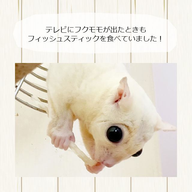 16年以上のおばあちゃんフクモモは、食べるものの偏りが激しい。フィッシュスティックは食べてくれるので、時々あげています。同じような商品でも、ペットショップで買うと味が違うのか食べてくれなくて。。。これからもよろしくお願いします