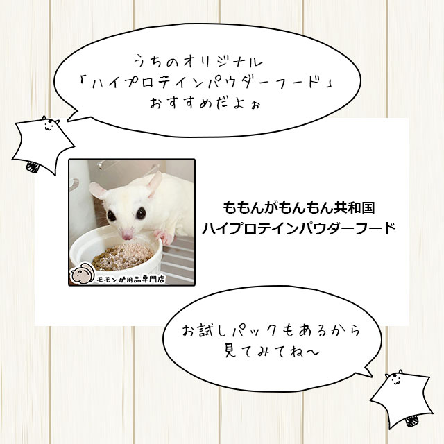 | こんな隅っこの文章まで読んでくれてありがとうございます。 当店ももんがもんもん共和国といいまして、フクロモモンガ用品の専門店をやっとります・・・ フクロモモンガはコアラやカンガルーの仲間で、外国ではSugar Glider(シュガーグライダー)と呼ばれています。 夜行性なので、エサは活動をし始める夕方~夜に与えるのがいいです。 時間を空けて2回に分けて与えるとさらに良いです。 栄養バランスが考えられているフクロモモンガ専用のフードがあります。 ペレットフードを食べてくれると、とても栄養管理がしやすくなります。 いろんな種類のフクロモモンガフードがあるので、お気に入りを探してみてください。 もんもん共和国のオリジナルフードは、食いつきの良さにこだわっています! 当店ではメール便対応のお試しフードも用意しています。50g~80gの少量サイズです。 偏食をしたり好みの個体差が激しいので、最初はお試しサイズがおすすめです。 フードの切り替えのときに個体によっては新しいエサを食べない場合があります。 前の餌に少しずつ混ぜて与え、徐々に慣らしながら切り替えましょう。 フクモモは野生だと虫を食べることが多いので、昆虫が大好物です。(たまに食べない子もいます) カルシウムが豊富なソルジャーグラブは、くる病予防にもオススメです。 ほかにもメジャーなミルワームやハニーワームなどいろいろ取り揃えています。 フクモモ専用フードやねぶくろポーチなどのフクモモグッズも取り扱っています。 寝ぶくろポーチは汚れやすいので、洗濯用に数枚用意してあげると便利です。 他の商品もぜひご覧になってみてくださいね! |
