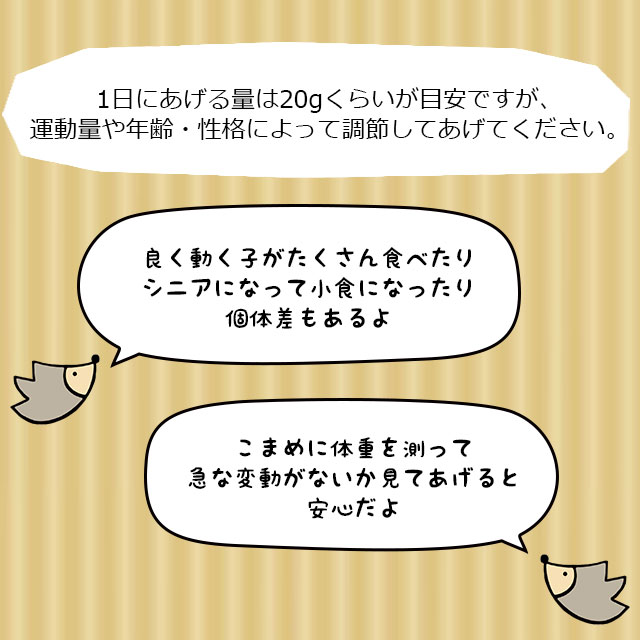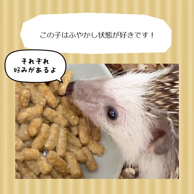 こんな隅っこの文章まで読んでくれてありがとうございます。 当店はりねずみんみん共和国といいまして、ハリネズミ用品の専門店をやっとります・・・ ハリネズミはねずみじゃなくてモグラの仲間で夜行性です。 エサは活動をし始める夕方~夜に与えるのがいいです。 時間を空けて2回に分けて与えるとさらに良いです。 ハリネズミ専用フードやチキンが主体のエサが安心です。 生後半年までは成長期なので、餌は食べ残しがあるくらい与えてもいいです。 ただし、肥満気味のときはフードの量を減らしたり低脂肪のダイエットフードに切り替えましょう。 当店では「Maruzi(マズリ)」「FAY(フェイ)」「ハーリーの主食」というハリネズミフードをおススメしています! ハリネズミはフードの切り替えのときに個体によっては新しいエサを食べない場合があります。 前のエサに少しずつ混ぜて与え、徐々に慣らしながら切り替えましょう。 当店ではメール便対応のお試しフードも用意しています。50g~100gの少量サイズです。 はりねずみは偏食をしたり、好みの個体差が激しいのでお試しにおすすめです。 はりねずみは野生だと虫を食べることが多いので、昆虫が大好物です。(たまに食べない子もいます) ミルワーム、ハニーワーム、ソルジャーグラブなど喜んで食べます。 |