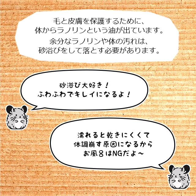 | このページを見ているってことは、チンチラを飼っていたり興味がある人ですね! こんな隅っこまで見てくれてありがとうございます… チンチラは、もともとアンデス山脈に住んでいた夜行性の草食動物です。 げっ歯類(ねずみの仲間)で、一生伸び続ける歯を持っています。 飼育時の食事は、主食の牧草(7~8割くらい)と栄養を補うペレットフードです。 牧草は一日中食べられるようにたっぷりと入れておくと、歯の伸びすぎや不正咬合(ふせいこうごう)の予防にもなります。 当店では主にペレットフードを取り扱っています。 メール便対応のお試しフードは、開封後すぐに小分けして密封パックしています。 こまめに小分けパックを使うと、保管中のにおい移りなどがないので新鮮です。 フワフワでずんぐりした体型に見えますが、運動が大好きですばやく動き回ります。 走るだけでなくジャンプしたり上下に動きまわるのも得意です。 いたずらも好きなので、お部屋で散歩させるときは目を離さないようにしてください。 せまいところに入り込んだり、家具やコード類なども齧ったりするので、サークルやフェンスを使うと安心です。 濡れると乾きにくいので、水浴びはNGです。 砂浴びで余分な皮脂(ラノリン)や汚れを取り除いて、体をきれいにしています。 当店オリジナルの砂浴び砂もあるので、ぜひご覧になってみてくださいね。 |
