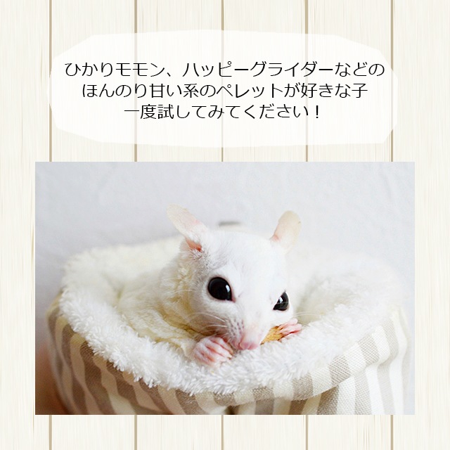 | こんな隅っこの文章まで読んでくれてありがとうございます。 当店ももんがもんもん共和国といいまして、フクロモモンガ用品の専門店をやっとります・・・ フクロモモンガはコアラやカンガルーの仲間で、外国ではSugar Glider(シュガーグライダー)と呼ばれています。 夜行性なので、エサは活動をし始める夕方~夜に与えるのがいいです。 時間を空けて2回に分けて与えるとさらに良いです。 栄養バランスが考えられているフクロモモンガ専用のフードがあります。 ペレットフードを食べてくれると、とても栄養管理がしやすくなります。 いろんな種類のフクロモモンガフードがあるので、お気に入りを探してみてください。 もんもん共和国のオリジナルフードは、食いつきの良さにこだわっています! 当店ではメール便対応のお試しフードも用意しています。50g~80gの少量サイズです。 偏食をしたり好みの個体差が激しいので、最初はお試しサイズがおすすめです。 フードの切り替えのときに個体によっては新しいエサを食べない場合があります。 前の餌に少しずつ混ぜて与え、徐々に慣らしながら切り替えましょう。 フクモモは野生だと虫を食べることが多いので、昆虫が大好物です。(たまに食べない子もいます) カルシウムが豊富なソルジャーグラブは、くる病予防にもオススメです。 ほかにもメジャーなミルワームやハニーワームなどいろいろ取り揃えています。 フクモモ専用フードやねぶくろポーチなどのフクモモグッズも取り扱っています。 寝ぶくろポーチは汚れやすいので、洗濯用に数枚用意してあげると便利です。 他の商品もぜひご覧になってみてくださいね! |